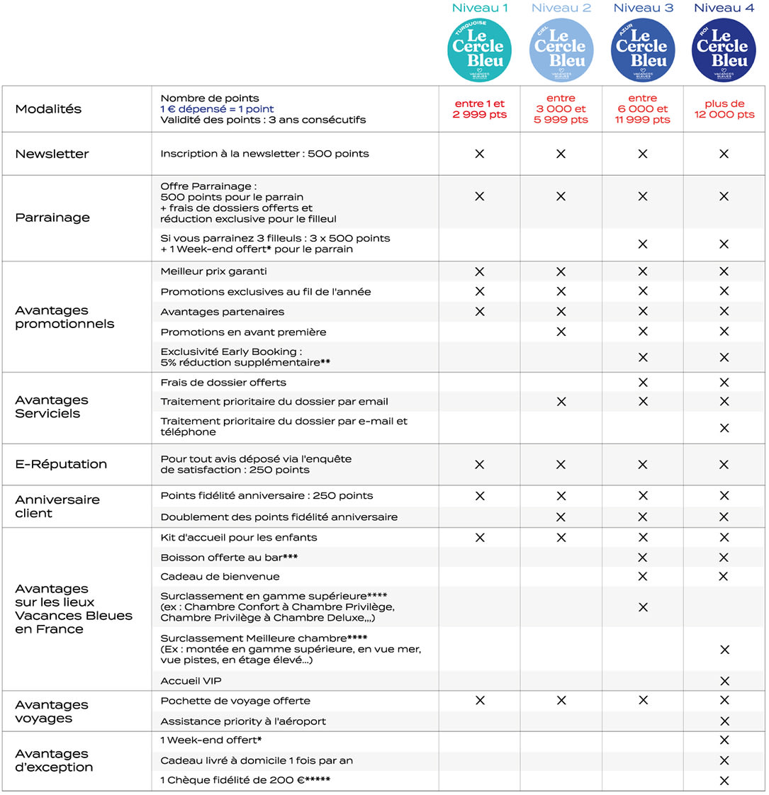 1€ dépensé = 1 point gagné : valable pour toute réservation d'un séjour sur une destination Vacances Bleues en France (hors destinations partenaires), ou bien pour tout séjour à l'étranger ou croisières.